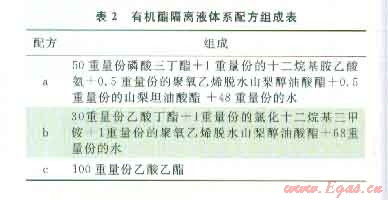 根據(jù)有機(jī)酯隔離液體系的組成,設(shè)計(jì)了3種具體的配方(表2),開展了配伍性和隔離效果評(píng)價(jià)。