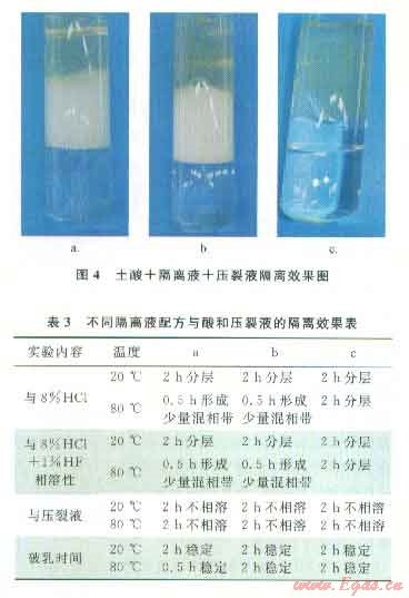 將各隔離液配方分別與酸和壓裂液混合,在低溫(20℃)和高溫(80℃)情況下靜置觀察,其結(jié)果表明有機(jī)酯隔離液能有效隔離前置酸和壓裂液(圖4和表3)。