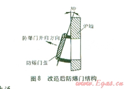 改造前后的防爆門結(jié)構(gòu)分別見圖7、8。改造前防爆門蓋與豎直爐墻的夾角為70°。由力學(xué)分析可知,防爆門蓋與豎直爐墻的夾角越大,需要的開啟力量就越大[3]。改造前防爆門蓋與豎直爐墻的夾角為70°,防爆門開啟需要的力很大。為解決防爆門開啟力大的問題,對(duì)原有防爆門進(jìn)行改造,改造后防爆門蓋與豎直爐墻的夾角變?yōu)?0°,這樣防爆門需要的開啟力就減小很多,爐內(nèi)壓力突然升高時(shí)可以迅速開啟泄壓,有效地防止?fàn)t內(nèi)壓力突然升高對(duì)尾部煙道頂部爐墻造成破壞。