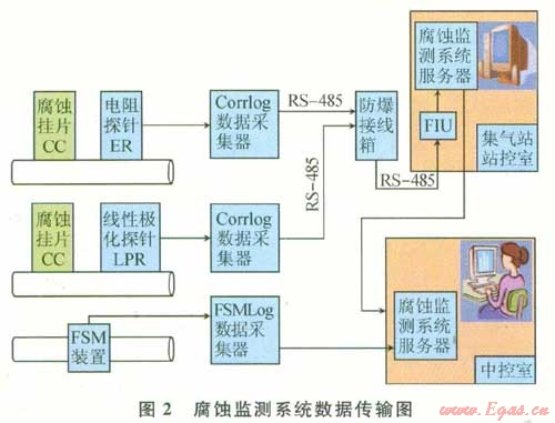 3 普光氣田地面集輸腐蝕監(jiān)測系統(tǒng)的構成及數(shù)據(jù)傳輸流向