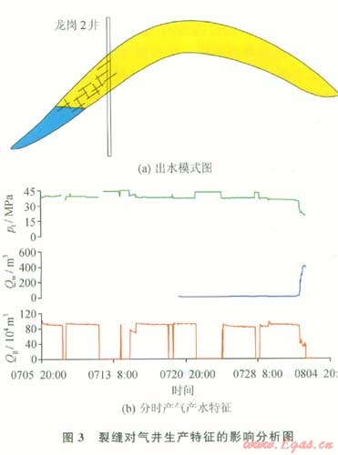 該類分布模式的氣藏沒有統(tǒng)一的氣水界面,有若干個氣水界面,但是整個氣水系統(tǒng)為同一個壓力系統(tǒng),由于儲層的變化,幾個獨立水體被封存在不同的儲層內(nèi)部,形成分散底水型氣水界面。同一個儲滲體中存在不同的氣水界面可能與成藏過程中氣的運移和原始地層水的排出有關(guān)系。龍崗2-龍崗l井區(qū)為典型的分散底水型氣分布模式。該類型氣水分布模式的氣井由于地層水能量有限,氣井在生產(chǎn)的同時能夠逐漸的帶出地層中的可動水而不影響氣井的高產(chǎn)。龍崗001-1和龍崗001-7井是該類型氣井的典型代表,目前日產(chǎn)氣大于50x104 m3,產(chǎn)水量小于10 m3,氣井生產(chǎn)能夠保持穩(wěn)定。