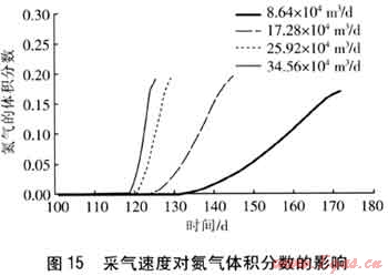 在目標(biāo)注氣量及注氣速度相同條件下,不同的采氣速度對(duì)儲(chǔ)氣庫(kù)運(yùn)行也有很大的影響(見(jiàn)圖12~15)。由圖12~15可知,采氣速度越快,地層平均壓力下降越快,注采井含水飽和度上升越快,天然氣與氮?dú)饣旌纤俣纫苍娇?。采氣速度越快,所需的墊層氣量越多,儲(chǔ)氣庫(kù)的回采率越低,而有時(shí)為了滿足調(diào)峰需要,可能需要較大的采氣速度。因此,必須綜合考慮各種因素,確定合理的采氣速度,保證調(diào)峰及采出氣體的質(zhì)量。