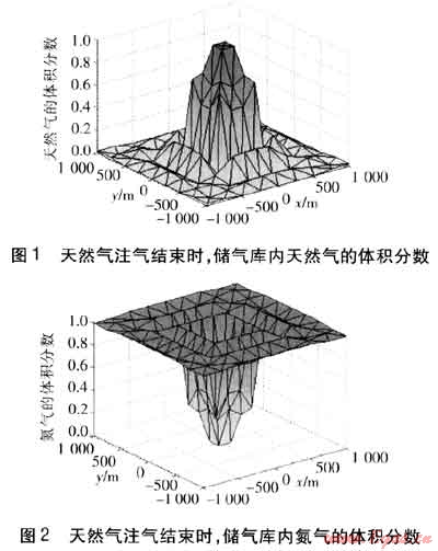 之后開始向儲(chǔ)氣庫(kù)注入天然氣,運(yùn)行到第116天時(shí),累積注入量(10022400m3)約達(dá)到目標(biāo)注氣量,停止注氣。天然氣注入結(jié)束時(shí),儲(chǔ)氣庫(kù)內(nèi)天然氣及氮?dú)獾捏w積分?jǐn)?shù)見(jiàn)圖1、2。由圖1、2可知,隨著天然氣的注入,天然氣逐漸將氮?dú)庀蛑車?qū)開,因而注采井周圍區(qū)域?yàn)榧兲烊粴鈪^(qū);由于氣體擴(kuò)散,天然氣與氮?dú)庀嗷交欤蚨鴱淖⒉删饾u向外,天然氣的體積分?jǐn)?shù)逐漸減小,氮?dú)獾捏w積分?jǐn)?shù)逐漸增大,形成天然氣與氮?dú)獾幕旌蠋?;再逐漸向外,為純氮?dú)鈪^(qū)。