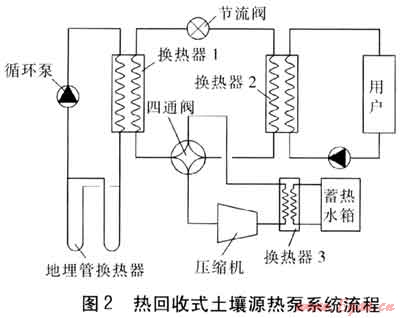 熱回收式土壤源熱泵是為了解決土壤取排熱不平衡提出的技術(shù),系統(tǒng)流程見圖2。在壓縮機(jī)出口增加換熱器3,無論冬夏季都可以提供生活熱水。夏季,壓縮機(jī)出口的高溫高壓制冷劑蒸氣,先經(jīng)過換熱器3與蓄熱水箱換熱,再經(jīng)過四通閥進(jìn)入換熱器1,通過地埋管換熱器把熱量排放到土壤中,這樣可適當(dāng)降低夏季向土壤的排熱量。冬季,地埋管換熱器從土壤中獲得的熱量同時(shí)滿足供暖和生活熱水要求。熱回收式土壤源熱泵在夏季可減少向土壤的排熱量,冬季增加從土壤中提取的熱量,實(shí)現(xiàn)全年土壤取排熱的基本平衡。