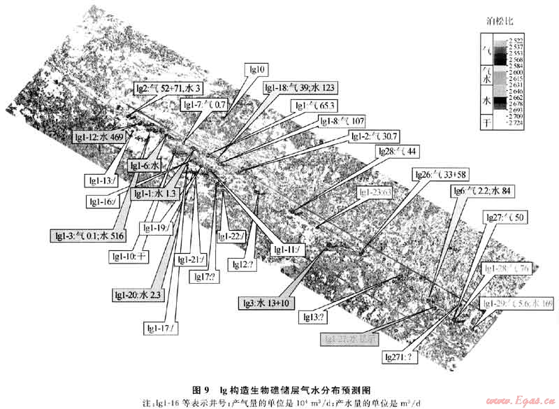圖9為lg構(gòu)造二疊系生物礁儲(chǔ)層氣水分布預(yù)測(cè)圖。該圖展示,構(gòu)造中部北東南西向有一明顯分界線,西南(左下半部)為臺(tái)地相沉積區(qū),西北部為海槽,中間為臺(tái)緣。預(yù)測(cè)臺(tái)地為含水及差儲(chǔ)層區(qū),中間為臺(tái)緣部位,為預(yù)測(cè)的含氣帶,東北部為海槽,預(yù)測(cè)出大片含氣區(qū)。該構(gòu)造儲(chǔ)層段鉆探大量井位,前期在臺(tái)緣部位取得較好效果,高產(chǎn)井較多(黃色、綠色文字框所示),但后來鉆遇大量氣水井或水井(綠色或藍(lán)色文字框所示),尤其在臺(tái)地部位部署的井位基本上為干井或水井(白色或藍(lán)色文字框所示),獲氣井很少。氣水預(yù)測(cè)結(jié)果與實(shí)鉆結(jié)果基本吻合。預(yù)測(cè)還表明,該區(qū)海槽部位還有大片含氣區(qū),但該區(qū)僅有l(wèi)g10井鉆達(dá)目的層,且不產(chǎn)氣,雖然該井預(yù)測(cè)與實(shí)鉆吻合,但沒有更多的井來證實(shí),且該區(qū)儲(chǔ)層情況還存在認(rèn)識(shí)上的爭(zhēng)議,要靠將來的實(shí)鉆進(jìn)一步驗(yàn)證。