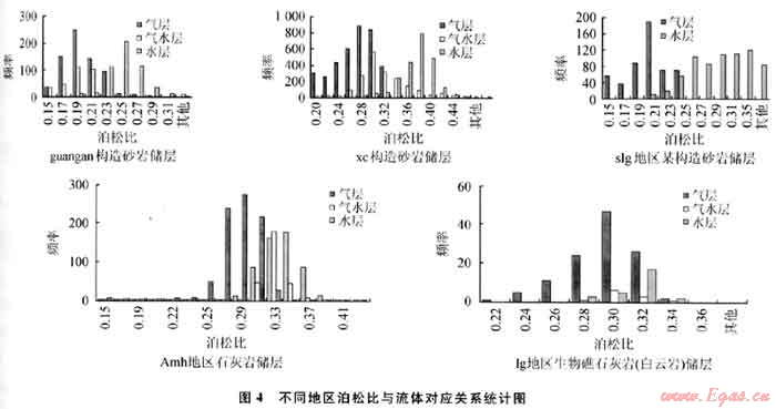 圖4為國內(nèi)外某些地區(qū)儲(chǔ)層泊松比測(cè)井資料與流體對(duì)應(yīng)關(guān)系統(tǒng)計(jì)圖。從圖中可見,盡管地區(qū)不同,儲(chǔ)層類型不同,但氣水關(guān)系始終具有一致特點(diǎn),即低泊松比對(duì)應(yīng)含氣,中泊松比對(duì)應(yīng)同含氣水,中高泊松比對(duì)應(yīng)含水,高泊松比對(duì)應(yīng)巖層。與前人研究成果都是一致的,只是具體儲(chǔ)層情況有分布范圍的差別。這也說明泊松比這些特點(diǎn)是由儲(chǔ)層及流體的物理性質(zhì)決定的,這種明確的關(guān)系確保了應(yīng)用泊松比進(jìn)行流體識(shí)別的可靠性。