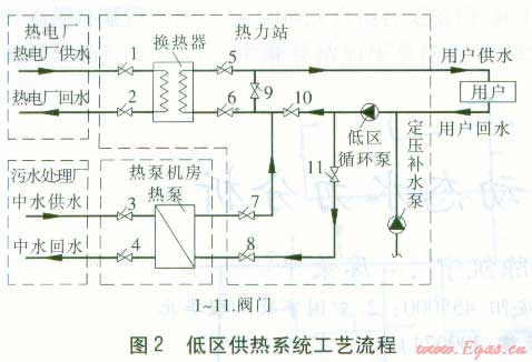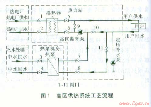 污水處理廠內(nèi)建有中水泵站l座,安裝3臺流量為625 m3h、揚程為40 m的循環(huán)泵,流量滿足熱泵需求,中水循環(huán)泵采用變頻調(diào)速(由供回水壓差控制)。將中水作為熱泵的低溫?zé)嵩?,在小區(qū)內(nèi)建造熱泵機房1座。將熱泵作為基本熱源,承擔(dān)設(shè)計負(fù)荷的75%左右。熱電廠作為峰荷熱源,并在嚴(yán)寒期單獨運行。小區(qū)內(nèi)建熱力站4座,由于l8層建筑比較分散,因此在1~3號熱力站內(nèi)分別設(shè)置l套高區(qū)系統(tǒng)和l套低區(qū)系統(tǒng),4號熱力站只設(shè)置l套低區(qū)系統(tǒng)。高區(qū)、低區(qū)供熱系統(tǒng)的工藝流程分別見圖1、2。