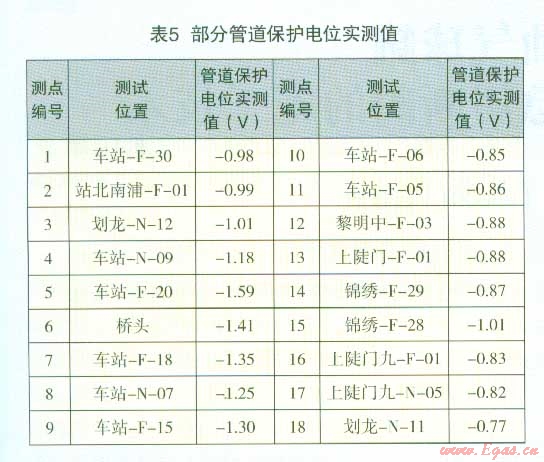 區(qū)域二兩座深井陽(yáng)極安裝后,對(duì)管網(wǎng)進(jìn)行了-段時(shí)間的極化,各測(cè)試點(diǎn)保護(hù)電位測(cè)試結(jié)果見(jiàn)表5,大多數(shù)檢測(cè)點(diǎn)的電位在-0.85V至-l.5V之間,達(dá)到了保護(hù)電位,但也有小部分電位在-0.85V以卜達(dá)不到保護(hù)電位,個(gè)別在-1.5v以下,管網(wǎng)處于過(guò)保護(hù)狀態(tài)。