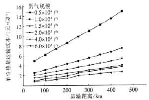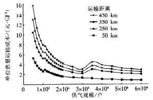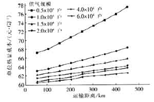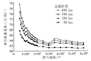 圖6 單位熱量運(yùn)輸成本隨供氣規(guī)模的變化曲線