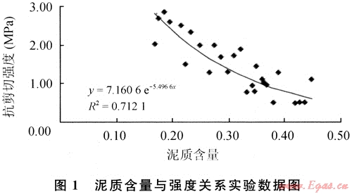 巖石抗剪切強度主要取決于泥質(zhì)含量與含水飽和度。根據(jù)參考文獻發(fā)表的實驗數(shù)據(jù),對單因素進行實驗數(shù)據(jù)分析,樣品的抗剪切強度與泥質(zhì)含量(含水飽和度20%)的回歸關(guān)系式為(圖1):
