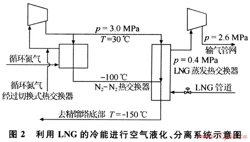 常用的空氣分離法是將空氣液化,通過氟利昂冷凍機、透平膨脹機進行空氣的液化和分離,制成液態(tài)的氮氣、氧氣、氬氣等。而LNG冷熱能用于空氣分離則是通過循環(huán)氮氣的冷卻來實現(xiàn)(見圖2)。一般來說,生產10×104m3的液態(tài)氣體大約需要650×104kJ的冷卻能。利用LNG的冷熱能,循環(huán)氮氣壓縮機可小型化;因不需要冷凍機,建設費用也可相應減少;此外,LNG作為空氣分離裝置的預冷劑,生產液氬的空分裝置中,利用其冷能冷卻和液化由下塔抽出經過復熱的循環(huán)氮,可以省去氟利昂制冷機以及氮透平膨脹機組,使產品能耗平均降低0.5kwh/m3,裝置的投資費用可減少10%左右,生產成本降低20%~30%。