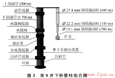該井井下配套裝置采用前述Ф44mm防腐防氣整筒式金屬柱塞泵、組合式井下高效多相分離器、承載閥裝置。井下桿管柱結(jié)構(gòu)經(jīng)過優(yōu)化設(shè)計,在現(xiàn)有抽油機(jī)條件下,采用Ф25.4mm×820m+Ф22.2mm×800m+Ф19.1mm×700m的D級抽油桿方案(圖3)。但由于機(jī)抽井少,桿柱調(diào)節(jié)困難,仍采用原井桿柱(即泵掛2200m),且由于配套抽油桿短節(jié)缺失,上部Ф25.4mm抽油桿與光桿之間采用臨時加工的普通平扣短節(jié)代替。