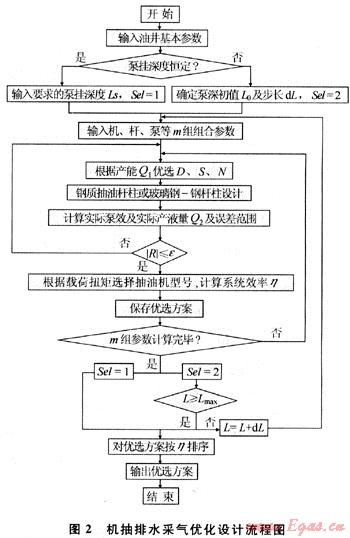 根據(jù)排水采氣井的地質(zhì)資料、生產(chǎn)數(shù)據(jù)、測井資料等數(shù)據(jù),在目前較為成熟的理論研究成果的基礎(chǔ)上,通過進(jìn)一步對機(jī)抽井的理論研究工作,研制出了“機(jī)抽排水采氣系統(tǒng)優(yōu)化設(shè)計軟件”。該軟件分為機(jī)抽井校核、機(jī)抽井設(shè)計、轉(zhuǎn)抽井設(shè)計、機(jī)抽井管理、機(jī)抽井診斷、實測系統(tǒng)效率計算、軟件幫助7大子系統(tǒng)[4~5]。應(yīng)用該軟件,在供排協(xié)調(diào)條件下對機(jī)一桿一泵系統(tǒng)進(jìn)行優(yōu)化設(shè)計與參數(shù)、設(shè)備等的優(yōu)選,其優(yōu)化設(shè)計流程如圖2所示。