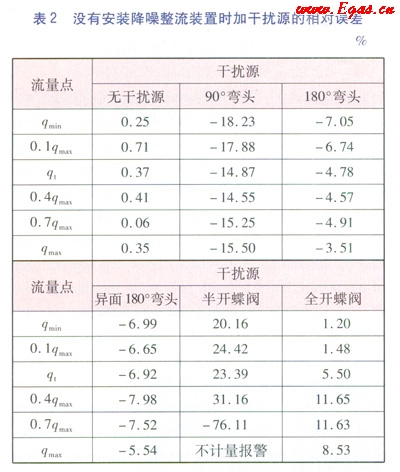 為了使試驗(yàn)結(jié)果更有對比性和說服力,對沒有安裝降噪整流裝置的AS超聲波流量計(jì)進(jìn)行了相同的試驗(yàn)。試驗(yàn)完畢后對數(shù)據(jù)進(jìn)行了統(tǒng)計(jì),具體數(shù)據(jù)見表2。通過數(shù)據(jù)分析,沒有安裝降噪整流裝置的AS超聲波流量汁在以上5種干擾源的環(huán)境下測量出來的相對誤差偏離非常大,最大達(dá)到了-76.11%左右。因半開的蝶閥能使氣流的方向傾斜向管壁,對AS超聲波流量計(jì)的計(jì)量結(jié)果影響最為突出。在檢定qmax流量點(diǎn)時因受斜向氣流的干擾,AS超聲波流量計(jì)出現(xiàn)了不計(jì)量報(bào)警的異常狀態(tài)。在超聲波流量計(jì)的電子系統(tǒng)中,能有效剔除由混響、電磁干擾等引起的計(jì)量誤差的算法不能消除機(jī)械情況下的干擾引。由此說明降噪整流裝置在整流方面起著決定性的作用。