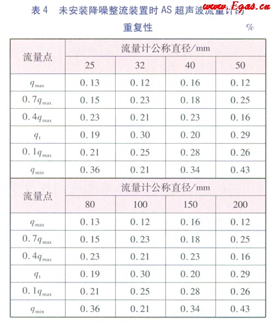 為了使得試驗(yàn)結(jié)果更具有對比性,把各個口徑的AS超聲波流量計(jì)拆下降噪整流裝置后按照所校驗(yàn)流量點(diǎn)進(jìn)行檢定,并統(tǒng)計(jì)各個流量點(diǎn)的重復(fù)性,見表4。