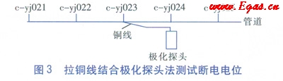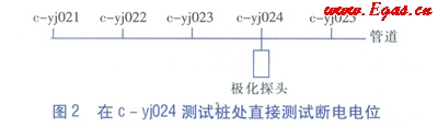 為了得到管道任意位置的陰極保護(hù)數(shù)據(jù),包括定向鉆穿越段中間部位、丟失的測(cè)試樁、占?jí)簾o(wú)法打開的測(cè)試井等處的陰極保護(hù)數(shù)據(jù),擬采用拉銅線和極化探頭相結(jié)合的方法進(jìn)行測(cè)試。為了驗(yàn)證該方法的可靠性及準(zhǔn)確性,選取c-yj024測(cè)試樁作為管道上任意測(cè)試點(diǎn)。步驟為: