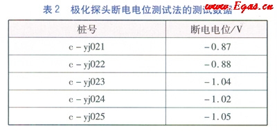 b.采用極化探頭法,在c-yj024測(cè)試樁上直接測(cè)試c-yj024測(cè)試樁處管道斷電電位U(測(cè)試方法見(jiàn)圖2),測(cè)試數(shù)據(jù)見(jiàn)表3,測(cè)試數(shù)據(jù)用來(lái)比對(duì)分析拉銅線結(jié)合極化探頭法的準(zhǔn)確、可靠性。