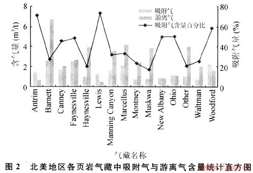 圖2為美國(guó)頁巖氣藏中的氣體組成統(tǒng)計(jì)結(jié)果,表明不同地質(zhì)條件下形成的頁巖氣藏其吸附氣與游離氣的含量存在較大差別。頁巖氣藏中吸附氣含量比例較高,變化范圍較大。頁巖含氣量最高的(如Barnett頁巖氣藏)可達(dá)10m3/t,最低(如New Albany頁巖氣藏)僅有1.1m3/t,含氣量平均為3.81m3/t。其中,吸附氣含量最低為16%,最高達(dá)80%。吸附氣含量的變化主要受巖石組成、有機(jī)質(zhì)含量、地層壓力、裂縫發(fā)育程度等因素影響,詳見后述。