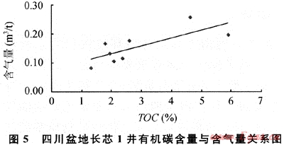 頁巖氣的勘探生產價值取決于其中游離氣和吸附氣的含量,游離氣的含量高低與其構造保存條件密切相關,而吸附氣含量受溫度、壓力等環(huán)境因素影響,在相同情況下,吸附氣量高低與有機質含量呈正相關。上揚子地區(qū)志留系烴源巖有機質豐度高,預計將會在構造保存條件差異較大的地區(qū)分別形成不同含氣量及含氣特點的頁巖氣聚集。在四川盆地,除已發(fā)現(xiàn)過去的老井在鉆探志留系頁巖段時具有豐富的氣顯示之外,目前完鉆的長芯1井初步分析結果顯示,在埋深淺于150 122龍馬溪組頁巖層段內,同樣發(fā)現(xiàn)了頁巖氣存在的證據(表2)。8個頁巖巖心的含氣量實驗結果顯示(解析溫度70℃),每噸巖石含氣量為0.08~0.25m3,平均為0.15m3/t。另從110m和120m巖樣的甲烷碳同位素分別為-40.2‰和-52.3‰來看,頁巖氣應為熱成因的天然氣。有機質豐度與含氣量的關系則顯示(圖5),同美國頁巖一樣,同樣具有有機碳含量與含氣量呈正相關的關系,即有機質豐度越高,含氣量越大。