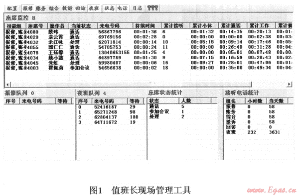 請(qǐng)注意,此處“當(dāng)前狀態(tài)”顯示的信息正是本文前述“工作狀態(tài)量化考核”中提及的基本內(nèi)容。如果“狀態(tài)”時(shí)間超標(biāo),對(duì)應(yīng)的“持續(xù)時(shí)間”一列數(shù)據(jù)顯示就會(huì)變成紅色,提示值班長(zhǎng)應(yīng)予重點(diǎn)關(guān)注,必要時(shí)進(jìn)行適當(dāng)干預(yù),確保服務(wù)熱線現(xiàn)場(chǎng)工作有序進(jìn)行。管理工具的下半部顯示出各技能分組隊(duì)列放置情況、當(dāng)前話務(wù)統(tǒng)計(jì)數(shù)據(jù)及坐席人員配置現(xiàn)狀。一旦有情況,當(dāng)班值班長(zhǎng)可以根據(jù)隊(duì)列狀態(tài)及時(shí)調(diào)整相關(guān)技能組的人員配置。