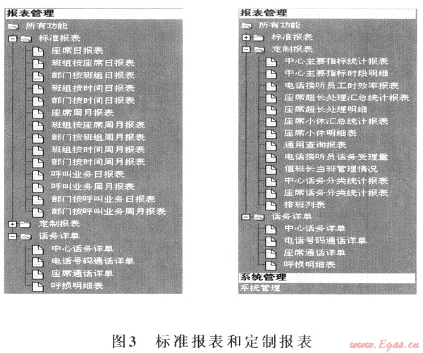 與服務(wù)熱線數(shù)字化管理的基本應(yīng)用工具比較,報(bào)表反映的內(nèi)容更全面更系統(tǒng)。尤其體現(xiàn)在熱線定制報(bào)表上。它把企業(yè)多年來(lái)在傳統(tǒng)數(shù)據(jù)統(tǒng)計(jì)匯總報(bào)表上積累的經(jīng)驗(yàn)作了優(yōu)化組合和集中提煉,針對(duì)性和效果都很好。圖3截取了報(bào)表管理系統(tǒng)中有關(guān)報(bào)表分類(lèi)的樹(shù)狀結(jié)構(gòu)分布。