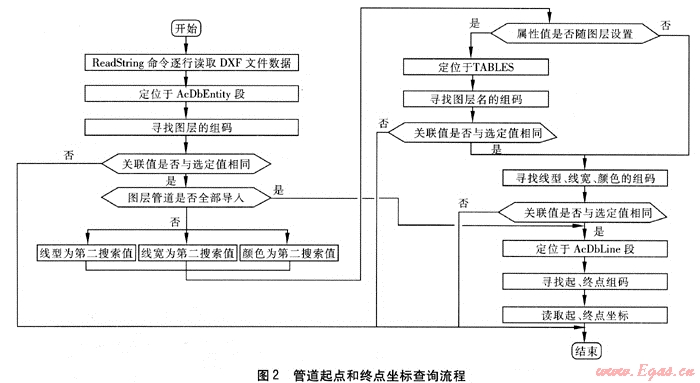 圖2為管道的起點和終點坐標的查詢流程圖。程序首先打開儲存管網(wǎng)信息的DXF文件,調(diào)用VC的ReadString命令逐行讀取管網(wǎng)數(shù)據(jù)。當查詢到儲存線段信息的AcDbEntity段,找到線段的圖層名組碼,如果組碼的關(guān)聯(lián)值與導入管網(wǎng)簡圖命令對話框的選定值相同,接著判斷此圖層中線段是否全部導入,如果全部導入,定位于AcDbEntity段下的AcDbLine子段,讀取線段的起點和終點坐標;如果還需要根據(jù)圖層中線段的屬性信息進一步進行篩選,則首先需要判斷是根據(jù)線段的顏色、線型、線寬3個屬性中哪個屬性進行選擇。例如選擇的是顏色屬性,首先判斷線段的顏色是否隨圖層設置,如果隨圖層設置,在TABLES段中,尋找圖層名的組碼,確定組碼的關(guān)聯(lián)值與選定值相同的圖層,接著尋找此圖層名下線段的顏色的組碼,如果組碼的關(guān)聯(lián)值與選定值相同,在AcDbLine段中找到此線段,然后讀取起點和終點坐標;如果線段的顏色不隨圖層設置,則直接在AcDbLine段中根據(jù)管道顏色找到該線段的起點和終點坐標即可[6~7]。