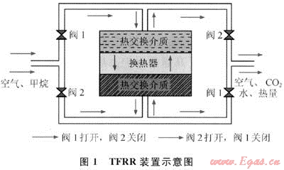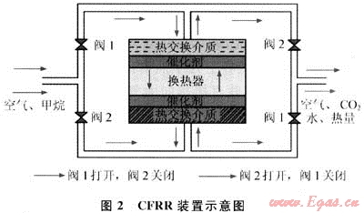 開始運(yùn)行時(shí),電熱元件對(duì)熱交換介質(zhì)進(jìn)行預(yù)熱,使之達(dá)到反應(yīng)所需要的溫度。一個(gè)循環(huán)包括兩次風(fēng)流轉(zhuǎn)向,每一次轉(zhuǎn)向稱為一個(gè)半循環(huán)。在第一個(gè)半循環(huán)中,甲烷和空氣的混合物以常溫通入反應(yīng)器,閥1打開,閥2關(guān)閉,風(fēng)流從反應(yīng)器頂部流向底部,當(dāng)空氣和甲烷的混合物到達(dá)熱交換介質(zhì)時(shí)發(fā)生氧化反應(yīng),放出熱量。產(chǎn)生的熱量及反應(yīng)產(chǎn)物持續(xù)通過反應(yīng)器的出口,出口處的熱交換介質(zhì)不斷吸熱,從而溫度不斷升高。而入風(fēng)側(cè)因風(fēng)流以常溫通過,熱交換介質(zhì)不斷被冷卻,當(dāng)冷卻到一定溫度時(shí),反應(yīng)器自動(dòng)轉(zhuǎn)換風(fēng)流方向,進(jìn)入第二個(gè)半循環(huán)。風(fēng)流從高溫側(cè)進(jìn)入,并吸收熱交換介質(zhì)的熱量,從而達(dá)到自燃溫度。反應(yīng)生成的熱量,一部分被熱交換器吸收,另一部分用于補(bǔ)償熱損失,從而往復(fù)循環(huán)。