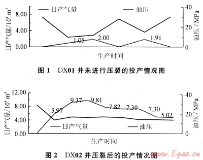 火山巖氣藏的探井要通過水力加砂壓裂改造,才能獲得較高的產(chǎn)能。因此水力壓裂是克拉美麗氣田氣井射后誘噴不出的有效手段。通過優(yōu)化壓裂工藝,氣田投產(chǎn)的9口井初期均取得了良好的生產(chǎn)效果。其中DX01和DX02井是井區(qū)最后投產(chǎn)的兩口井,由于冬季壓裂施工難度大,DX01井未進(jìn)行壓裂(圖1),雖然關(guān)井油壓達(dá)30MPa,但開井氣量下降快,無法連續(xù)生產(chǎn)。DX02井壓裂后生產(chǎn)較為穩(wěn)定(圖2)。