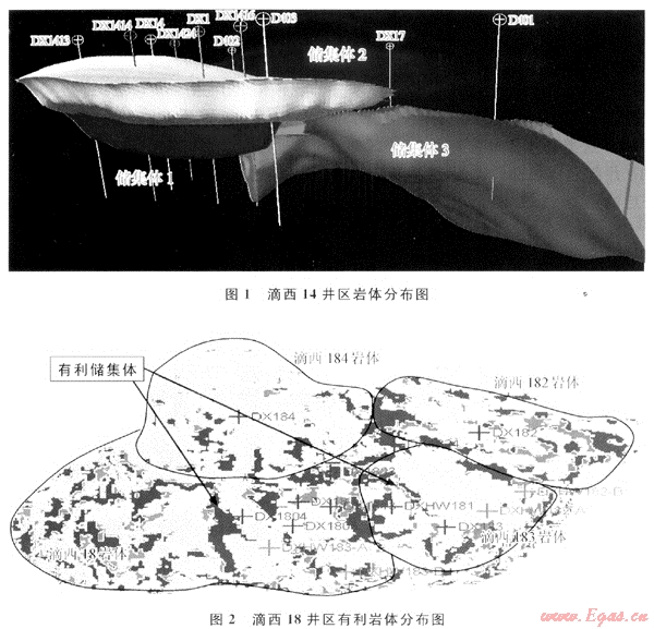 滴西14井區(qū)為多錐型復(fù)合火山機構(gòu),以爆發(fā)相為主,經(jīng)歷多期次噴發(fā)及水流搬運沉積,形成3個火山巖體(圖1),對應(yīng)3個儲集體,具有“兩弱一強”的地震反射特征,有利儲層為爆發(fā)相的火山角礫巖儲層(儲集體1和儲集體2)。