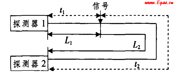 當外界振動信號作用于M—Z光纖干涉系統(tǒng)的兩個干涉臂時,傳感光分別向左右兩個方向傳輸至探測器1和探測器2(見圖 2)。檢測比較兩組干涉光的時間差即可判斷振動事件發(fā)生的位置(見圖 3)。