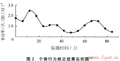 目前,行為科學在現(xiàn)代安全管理科學中日益受到重視,研究成果取得有效的收益。實驗表明,在個體行為矯正方法的實施過程中,由于員工不安全行為的減少,事故率呈周期性下降趨勢(圖2)[5]。根據(jù)海因里西(Heinrich)事故三角形可知,即使是輕微事故的減少,也會對預防重大事故的發(fā)生產(chǎn)生重要意義。