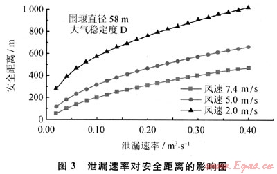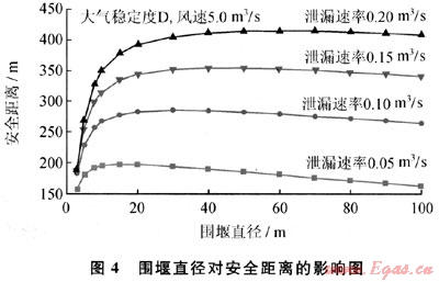 LNG儲(chǔ)罐周圍通常要設(shè)計(jì)圍堰,以防止儲(chǔ)罐發(fā)生泄漏時(shí),液體四處流淌蔓延,若發(fā)生火災(zāi),還可以防止火焰蔓延到周邊地區(qū)[4]。LNG泄漏到圍堰內(nèi),會(huì)迅速蒸發(fā)氣化,形成以圍堰為二次源的蒸氣云團(tuán)擴(kuò)散。圖4給出下風(fēng)向安全距離隨著圍堰直徑和泄漏速率的變化。當(dāng)圍堰尺寸較小時(shí),以圍堰為二次源云團(tuán)的范圍也較小,有限的蒸發(fā)氣受大氣湍流影響,其濃度較快稀釋,安全距離較小;當(dāng)圍堰尺寸過(guò)于增大時(shí),二次源云團(tuán)的天然氣濃度較低,其下風(fēng)向擴(kuò)散距離不再增加,反而略有減少。