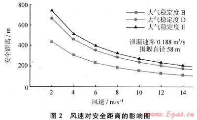 所建立的LNG泄漏氣體擴(kuò)散模型計(jì)算方法,經(jīng)過(guò)實(shí)驗(yàn)驗(yàn)證,其平均偏差為24.28%,并較準(zhǔn)確地體現(xiàn)了重氣擴(kuò)散過(guò)程中云團(tuán)內(nèi)部特性的變化規(guī)律。對(duì)于穩(wěn)態(tài)LNG氣體擴(kuò)散,當(dāng)風(fēng)速大于2m/s時(shí),隨著風(fēng)速的增加,安全距離是逐漸減小的;對(duì)于較小風(fēng)速(小于2m/s)時(shí),該穩(wěn)態(tài)模型將不再適用。泄漏速率增大使安全距離幾乎成比例增大,是影響安全距離最重要因素之一。對(duì)于給定的LNG泄漏率,圍堰尺寸變化對(duì)安全距離的影響會(huì)呈現(xiàn)出一個(gè)弱峰,之后安全距離會(huì)隨圍堰尺寸的增加而略有減小。