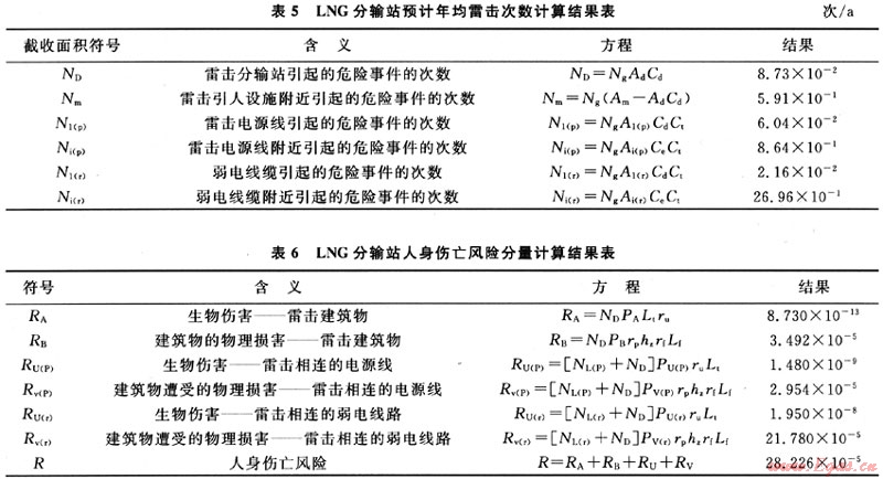 選定相關(guān)參數(shù)后,根據(jù)規(guī)范IEC60305中給定的公式,先后計算出建(構(gòu))筑物及引入設(shè)施截收面積(結(jié)果見表4)、預(yù)計年累計次數(shù)(結(jié)果見表5)、人身傷亡風(fēng)險分量(結(jié)果見表6)等值(表4~6中方程引自本文參考文獻[3])。