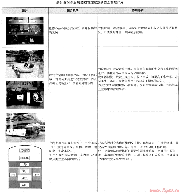 燃?xì)馄髽I(yè)是沒有“圍墻的工廠”,存在很多臨時(shí)作業(yè)場所。如:井室搶維修作業(yè)、戶內(nèi)安檢作業(yè)等。相對(duì)來說這些臨時(shí)性作業(yè)場所不穩(wěn)定因素較多,現(xiàn)場的安全控制更加重要。通過0HSAS18001我們可以識(shí)別了存在的風(fēng)險(xiǎn)、制定了安全措施和作業(yè)管理流程、以及應(yīng)急預(yù)案等,如果和5S現(xiàn)場定置管理結(jié)合起來,可以取得更好的成效。見表3: