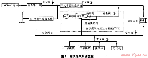 天津鋼管制鐵有限公司煤氣系統(tǒng)的工藝流程是[1]:高爐產(chǎn)生的煤氣通過高爐下降管至重力除塵器,重力除塵器后的荒煤氣至干式布袋除塵系統(tǒng),干式除塵后的凈煤氣通過調(diào)壓閥組或高爐煤氣余壓發(fā)電系統(tǒng)(TRT)調(diào)壓后至凈煤氣管網(wǎng),通過凈煤氣管網(wǎng)分配給用戶。高爐煤氣的用戶主要是3臺頂燃式熱風(fēng)爐、2臺鍋爐、1臺燒結(jié)機,剩余煤氣放散。高爐頂壓為180kPa,調(diào)壓后的煤氣壓力為9kPa,高爐煤氣平均流量20×104m3/h,最大流量為23×104m3/h,熱風(fēng)爐的用氣量為(6~10)×104m3/h,鍋爐的用氣量為7×104m3/h,燒結(jié)機的用氣量為8000m3/h,有(2.2~9.2)×104m3/h煤氣需通過放散塔放散。高爐煤氣系統(tǒng)流程見圖1。