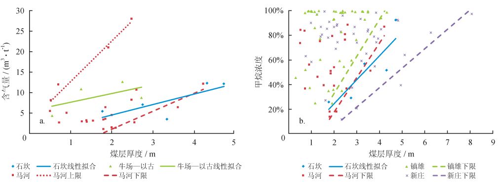 含氣量與煤厚大體上呈正相關(guān)關(guān)系,部分礦區(qū)含氣量與煤厚呈較明顯的線性正相關(guān)關(guān)系,如石坎礦區(qū)(相關(guān)系數(shù)R 為0.6)。較常見(jiàn)的情況是含氣量與煤層厚度之間存在一定的離散性,但其中煤層厚度與含氣量上限及含氣量下限同時(shí)存在較明顯的線性關(guān)系,如馬河礦區(qū)(圖5-a)。甲烷濃度的下限與煤厚普遍表現(xiàn)為正相關(guān)關(guān)系,反映煤層厚度的增加有助于煤層氣的保存(圖5-b)。總之,煤層厚度不僅控制了煤儲(chǔ)層的生氣潛力,對(duì)煤層氣保存也有一定影響,在煤層頂?shù)装灞4鏃l件不理想的情況下,煤層厚度對(duì)含氣量的影響更為顯著。