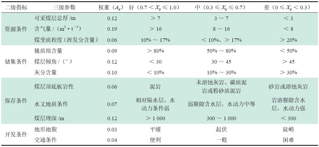 表3 鎮(zhèn)威煤田煤層氣選區(qū)評(píng)價(jià)參數(shù)及權(quán)重參數(shù)表