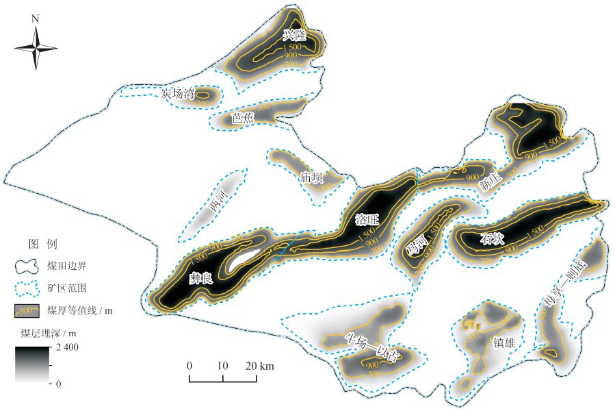 鎮(zhèn)威煤田各礦區(qū)向斜構(gòu)造中煤層埋深由南向北呈深淺相間的分布特征,整體上煤田東南部煤層埋深較淺,包括母享—則底、鎮(zhèn)雄、牛場(chǎng)—以古礦區(qū),一般不超過(guò)1 000 m。煤田中部各礦區(qū)向斜軸部煤層埋藏較深,深度超過(guò)1 500 m,煤層氣保存條件較好,包括石坎、馬場(chǎng)、新莊、洛旺及彝良礦區(qū)。而煤田西北部?jī)H鹽津礦區(qū)埋藏較深,可達(dá)1 500 m,其余礦區(qū)埋深均未超過(guò)1 000 m(圖6)。