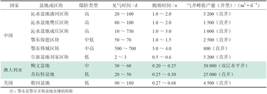 表2 中外煤層氣產(chǎn)區(qū)氣井見(jiàn)氣時(shí)間、產(chǎn)氣爬坡期數(shù)據(jù)對(duì)比表