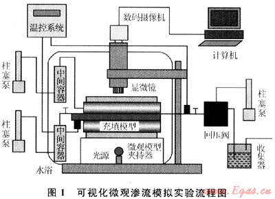 通過二維可視化物理模擬技術[4],可以定性和定量地觀察流體在地層內的流動變化。二維可視化物理模擬技術分為間接技術和直接技術。間接技術主要有X射線、γ射線等菹接技術運用光源的照射,通過照相、攝像等使流動實驗過程可視化,直接技術相對成熟。