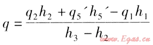 式中q5”、h5”與待求量q相關(guān),但由于q5”很小,僅約占q5(q5=q5’+q5”)的0.3%,q5”h5”也僅約占(q2h2-q1h1)的0.4%,將其略去,上式變成: