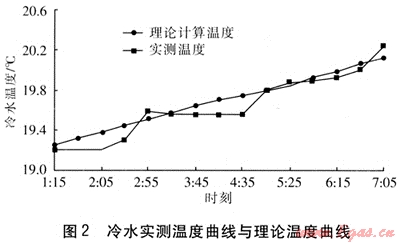 某日冷水機(jī)組關(guān)機(jī)后,不同時(shí)刻冷水實(shí)測(cè)溫度與由式(5)計(jì)算得到的理論溫度的比較見(jiàn)圖2。由圖2可知,實(shí)測(cè)溫度與由式(5)計(jì)算得到的理論溫度吻合較好,因此可采用式(5)計(jì)算停機(jī)后某時(shí)刻冷水溫度。