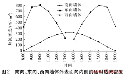 墻體內(nèi)外側(cè)表面?zhèn)鳠嵯禂?shù)分別取8.7、23.3W/(m2·K),根據(jù)文獻(xiàn)[7]提供的圍護(hù)結(jié)構(gòu)基本耗熱量及圍護(hù)結(jié)構(gòu)傳熱系數(shù)計(jì)算式,計(jì)算得出圍護(hù)結(jié)構(gòu)傳熱系數(shù)為0.3W/(m2·K)。若室內(nèi)溫度保持18℃,根據(jù)傳統(tǒng)墻體供暖熱負(fù)荷計(jì)算方法,得到單位面積基本耗熱量為17.7W/m2。由圖2可知,除了南向墻體8:00、19:00兩個時刻熱流密度小于17.7W/m2外,其余時刻在太陽輻射條件下3個朝向墻體外表面向內(nèi)側(cè)的熱流密度均遠(yuǎn)高于單位面積基本耗熱量。因此,在實(shí)際設(shè)計(jì)及運(yùn)行中,應(yīng)根據(jù)建筑墻體朝向及太陽輻射情況,采用合理的供暖系統(tǒng)運(yùn)行方案,這樣既能滿足供熱要求,又能合理地使用能源,降低運(yùn)行成本。