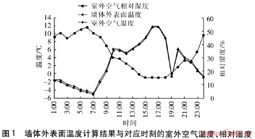 為了對太陽輻射條件下墻體外表面向內(nèi)側(cè)的傳熱量進(jìn)行分析,選定墻體結(jié)構(gòu)及材料熱工性能參數(shù)見表1,熱工性能參數(shù)滿足DB 63/643—2007《青海省居住建筑節(jié)能設(shè)計(jì)標(biāo)準(zhǔn)》。墻體外表面為淺色涂料,建筑物四周為綠色草坪。墻體外表面溫度采用有限差分法進(jìn)行計(jì)算,并采用ANSYS計(jì)算軟件對結(jié)果進(jìn)行校核。墻體外表面溫度計(jì)算結(jié)果與對應(yīng)時刻的室外空氣溫度、相對濕度見圖1。