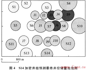 圖4是根據(jù)圖版預(yù)測得到的S14加密井組最終井控動態(tài)儲量泡泡圖,可以看出它與生產(chǎn)早期的動態(tài)分析結(jié)果(圖2)相比有很大差異。生產(chǎn)至廢棄時,S14加密井組的平均最終井控動態(tài)儲量為2920×104m3(最終可采出氣量為2480×104~2630×104m3),平均最終泄流面積為0.206km2,由于儲層具有較強(qiáng)的非均質(zhì)性。因此各單井的最終井控儲量和泄流面積之間存在較大的差異。