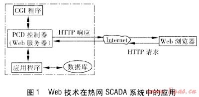實(shí)現(xiàn)分布式Web技術(shù)熱網(wǎng)SCADA系統(tǒng)的前提條件就是必須采用嵌入Web服務(wù)器功能的PCD控制器。PCD控制器將采集到的熱網(wǎng)信息及時(shí)發(fā)布到Internet上去,熱力站的運(yùn)行管理人員可以隨時(shí)隨地用Web瀏覽器進(jìn)行遠(yuǎn)程訪(fǎng)問(wèn),獲取最新的熱力站現(xiàn)場(chǎng)運(yùn)行信息,實(shí)現(xiàn)對(duì)熱網(wǎng)實(shí)時(shí)有效的遠(yuǎn)程監(jiān)控和集中管理。因此,采用分布式Web技術(shù)的熱網(wǎng)SCADA系統(tǒng)是今后的發(fā)展方向。