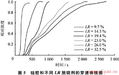 我國GB 17820一1999《天然氣》規(guī)定,城市管道天然氣中硫化氫含量標準為:一類天然氣中硫化氫含量不大于6mg/m3,二類天然氣中硫化氫含量不大于20mg/m3,三類天然氣中硫化氫含量小于460mg/m3。而GB 18047—2000《車用壓縮天然氣》規(guī)定,車用壓縮天然氣中硫化氫含量不大于15mg/m3。由圖5可以看出,LR>14.3%的脫硫劑,硫化氫穿透時間長于300s,即300s內產品氣中不含硫化氫,符合一類城市管道天然氣和車用天然氣用氣要求。