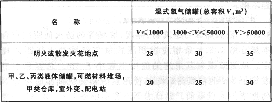 表4.3.3 濕式氧氣儲(chǔ)罐與建筑物、儲(chǔ)罐、堆場(chǎng)等的防火間距(m)