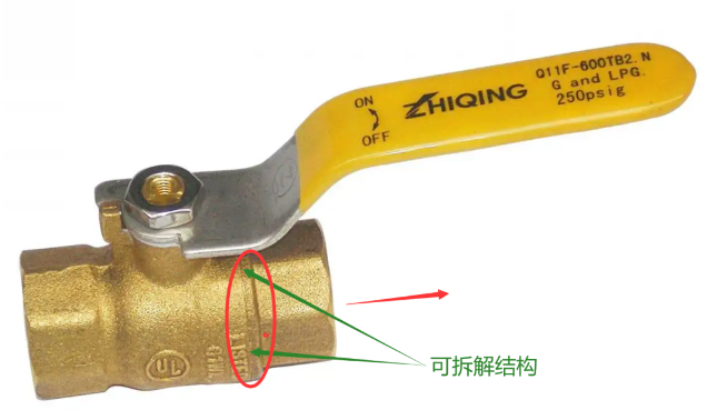 如果上述的球閥安裝方向分正反的話,那這種常見的球閥我想是不是也該按紅色箭頭安裝方向進行安裝。因為右側也是一個可拆解的結構(猜測很難拆解,但維修過閥門的都知道,另外閥門本體此處泄漏的可能性有多少?)。